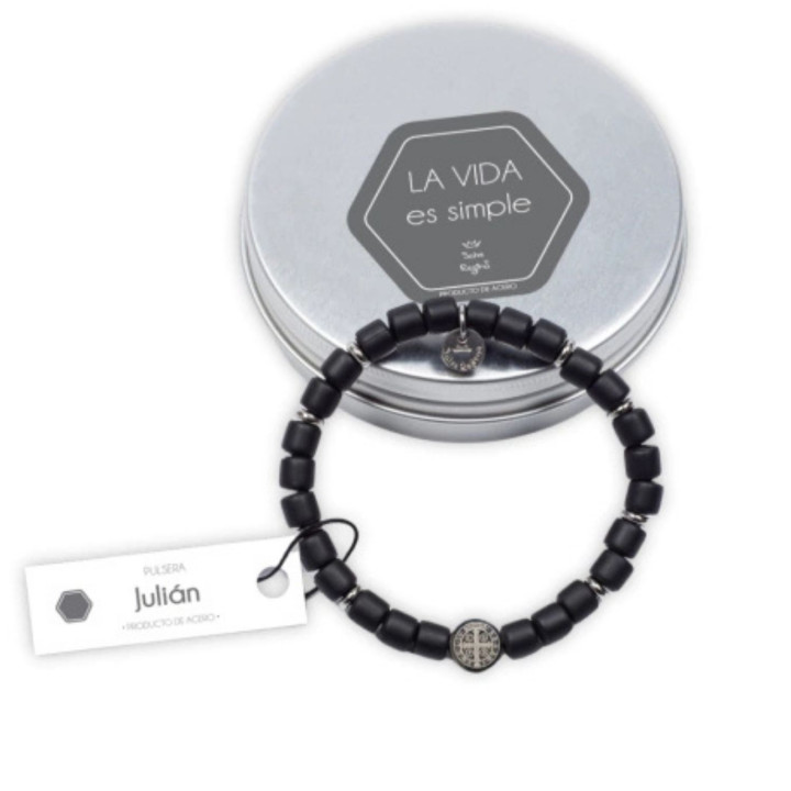 pulsera ideal para hombre en cuentas de caucho y medalla de acero de San Benito muy duradera.